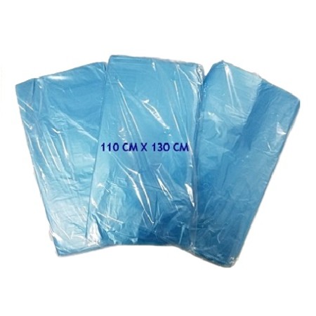 Capa de plastico extra largo de 130 cm y ancho 110 cm en color azul. Calidad excelente con buena densidad. Se presenta en bolsa de 50 unidades. Facil de retirar de uno en uno. Precio con descuento a partir de 5 paquetes y 15 unidades. Para mas cantidades consultar.