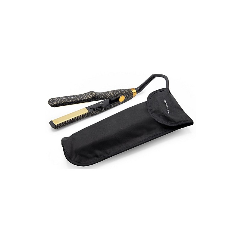 Plancha Mini Corioliss Gold Leopard de increibles prestaciones. Fabricado con materiales de alta calidad ofrece planchados con las mismas caracteristicas que una plancha grande. Con placas de Titanio basculantes permite planchar y rizar de forma rapida. Control de temperatura de 150 a 210 ºC. Tecnologia Iones Negativos que evita la electricidad estatica. Cable profesional de 2,2 metros y giratorio. Con funda.
