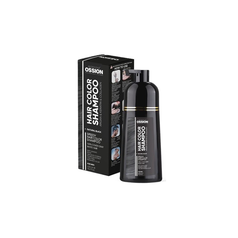 Champu para teñir el cabello rápido y cómodamente. Con 100% cobertura en canas realiza además una limpieza profunda y reparador. Color permanente de larga duracion. En 8 minutos de aplicacion consigue el color deseado tanto en cabello como barba y el bigote. Con Aceite de Argán, Queratina y Colágeno el cabello queda nutrido, fortalecido y sano. Envase con dosificador de 420 ml.
