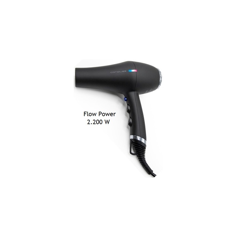 Secador Corioliss Flow Power Black Chrome con motor profesional AC de 2.200 W. Indicador led de temperatura, 2 Velocidades, 2 Temperaturas, Boton de Aire Frio, 2 Boquillas, Generador de Iones y cable de 3 Metros.
